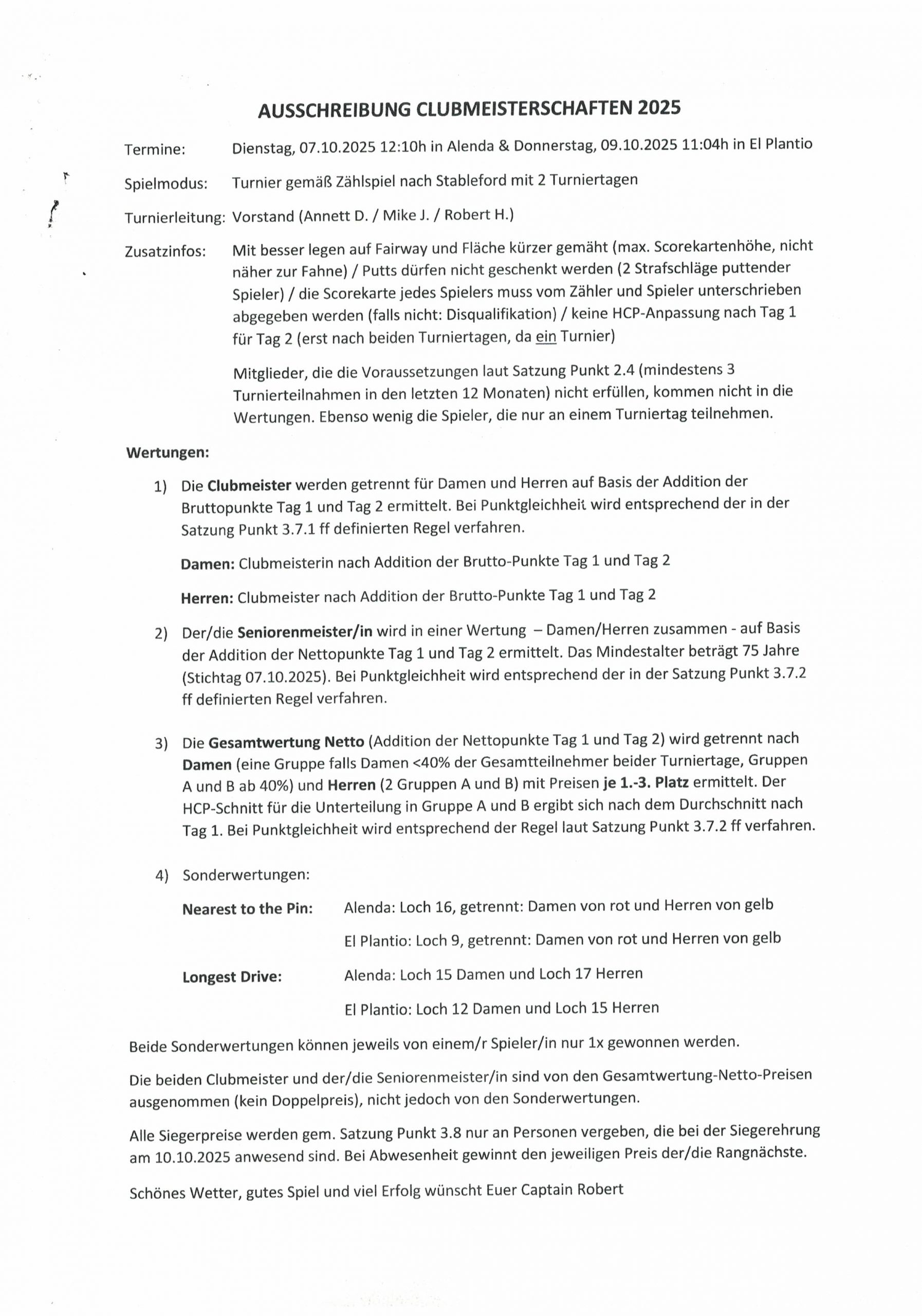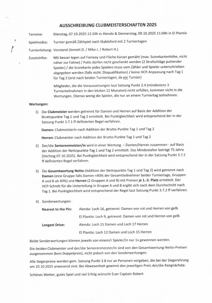 Ich wünsche allen viel Erfolg und Spaß bei der anstehenden Clubmeisterschaft am Dienstag und Donnerstag! Es werden bestimmt spannende Golftage.
